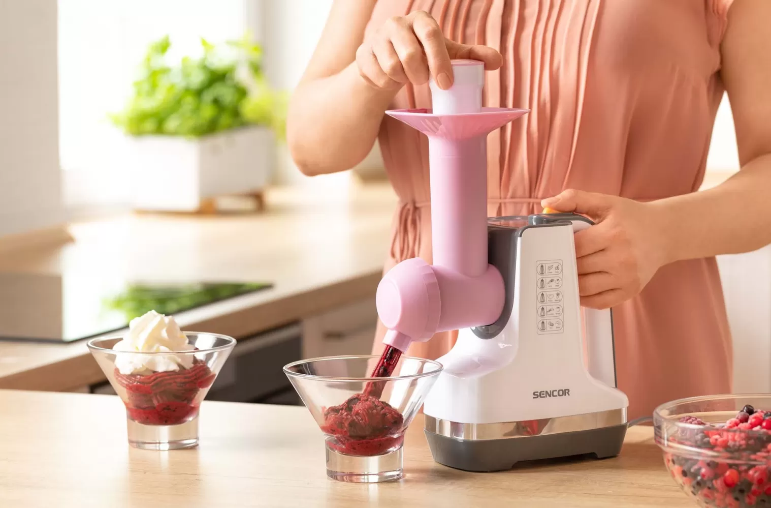 • Nástavec pro rychlou a jednoduchou výrobu lahodných, přírodních, zmrzlinových dření bez chemických přísad. Stačí vložit zmrzlé ovoce, které máte rádi a během okamžiku si budete užívat čerstvý domácí sorbet kdykoliv budete chtít