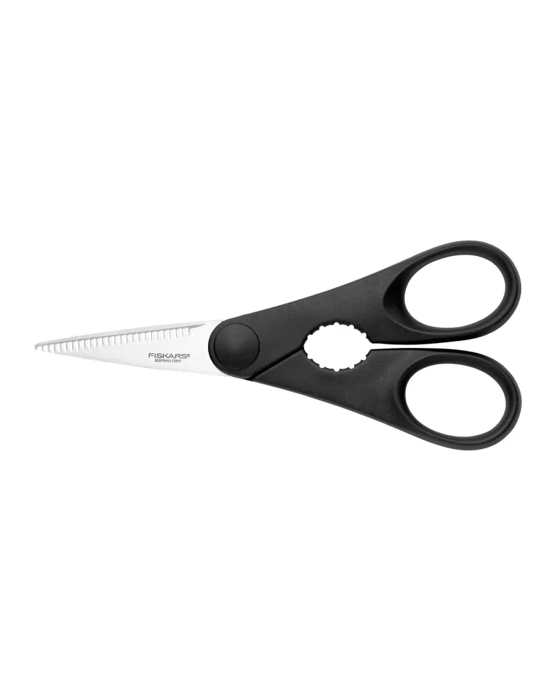 Nůžky kuchyňské Fiskars 1023820 Silné ostré čepele se zoubky, které usnadňuje střihání. Otvirák na PET lahve Všestranné nůžky do kuchyně … Celý popis