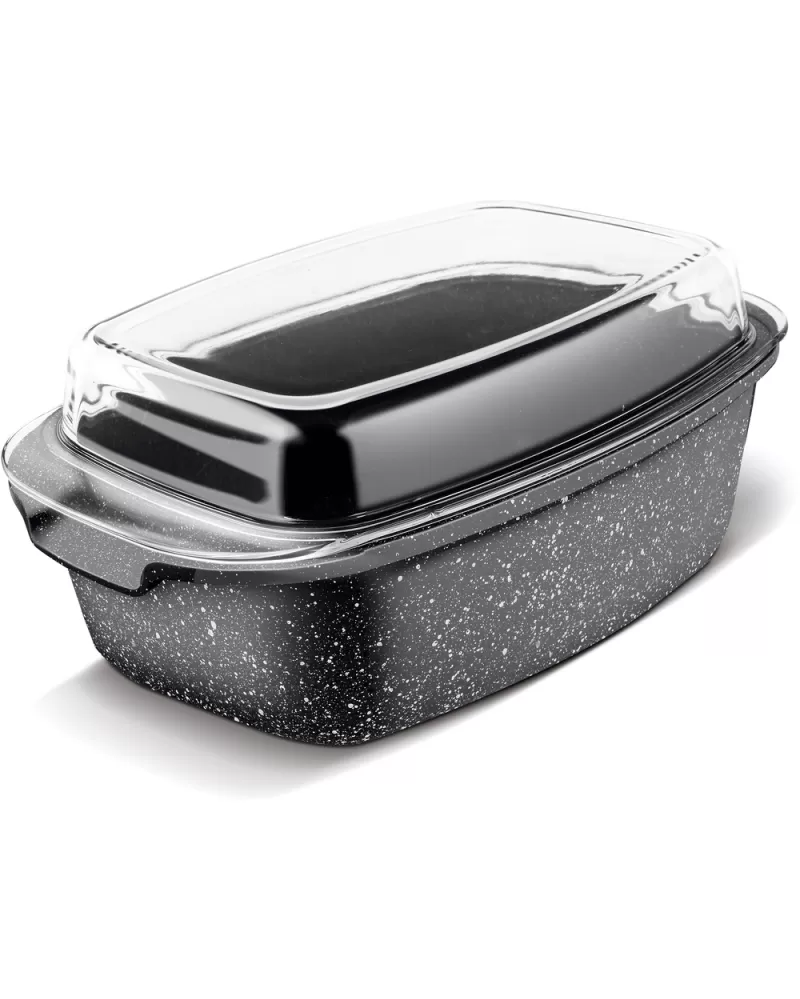 • Pekáč se skleněnou poklicí opatřen vnitřním marble povrchem odolným proti oděru a připalování, silným dnem a velmi elegantní rukojetí