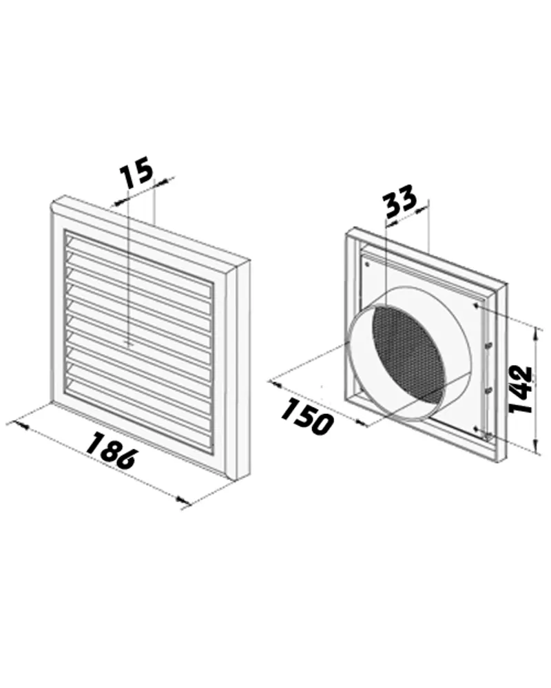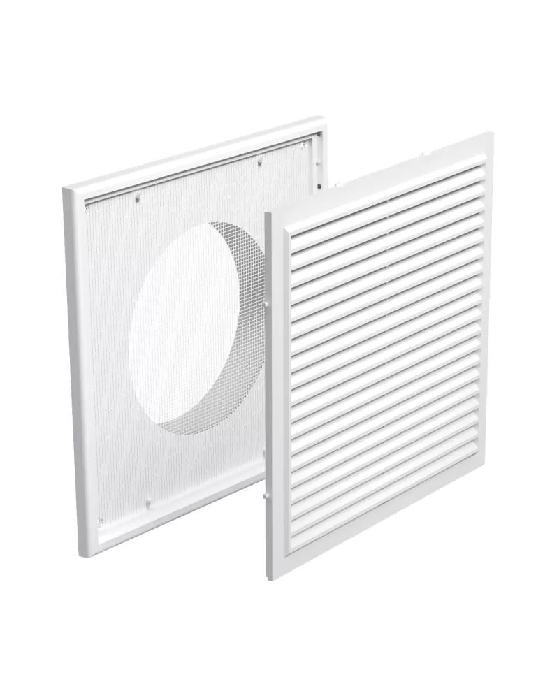 • Bílá plastová větrací mřížka se síťkou 186x186 mm a přírubou O 150 mm je vhodná jak pro větrání, tak i nasávání
