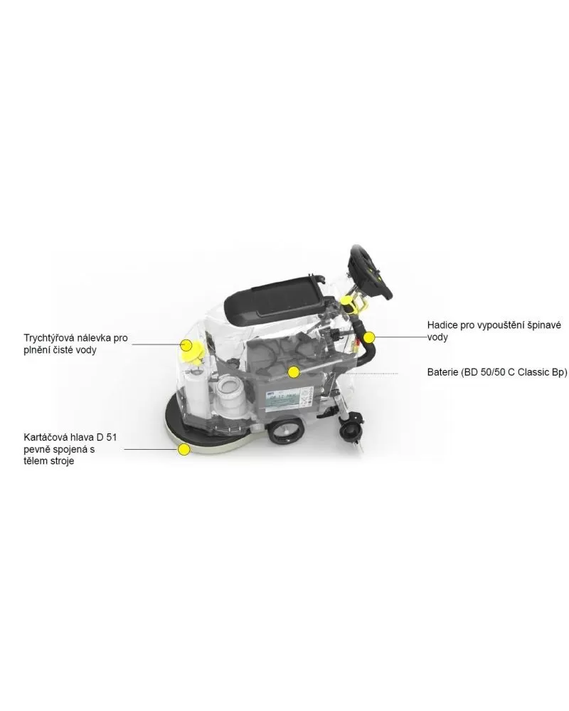 Kompaktní podlahový stroj v moderním designu se systémem dvou nádrží a jednoduchou obsluhou. Stroj KÄRCHER BD 50/50 C Classic BP disponuje snadnou výměnou kartáče bez použití nářadí a také baterie.