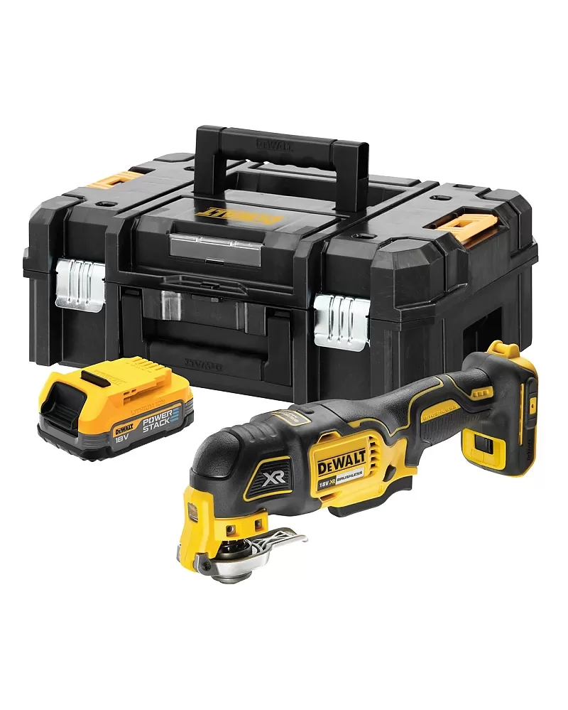 Aku oscilační multibruska 18V 1x1,7Ah DeWALT POWERSTACK DCS356E1T se systémem rychlé výměny nástrojů bez nářadí.