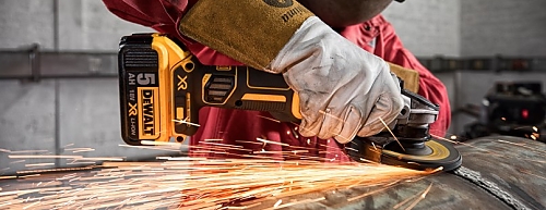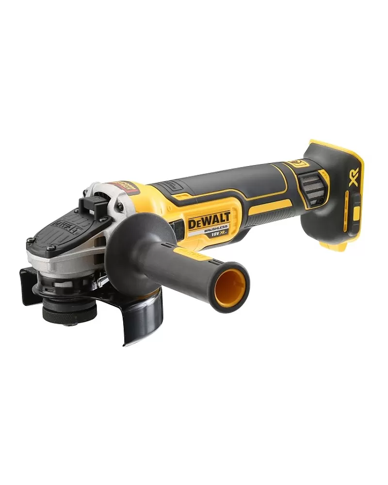 Aku úhlová bruska 125mm bez aku DeWALT DCG405NT vybavená bezuhlíkovým motorem, elektronickou brzdou a elektronickou spojkou.