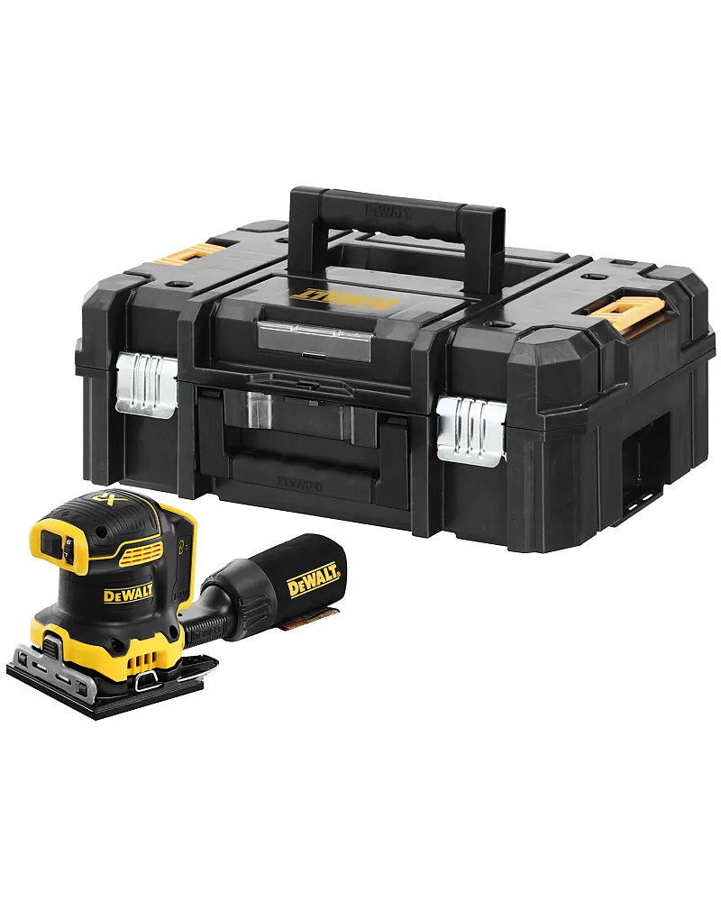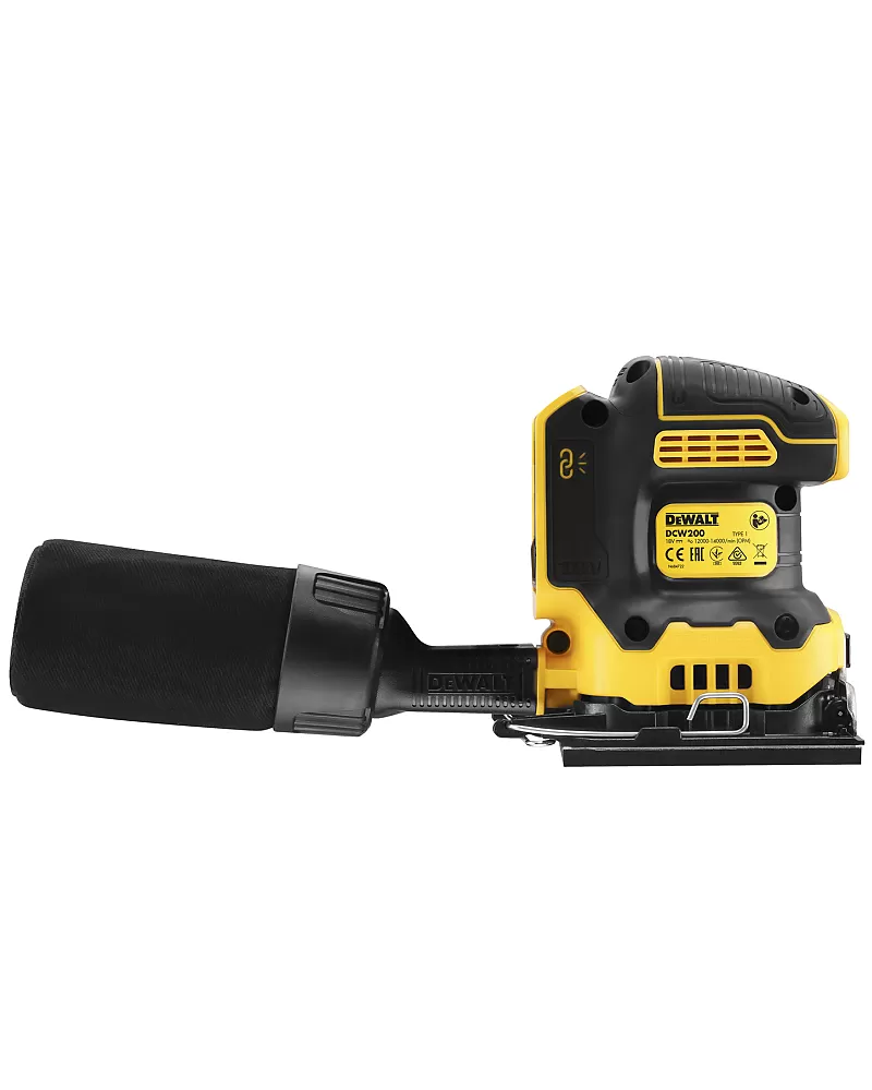 Aku vibrační bruska 18V bez aku DeWALT DCW200NT s bezuhlíkovým motorem a brusnou plochou o velikosti 115x108 mm.