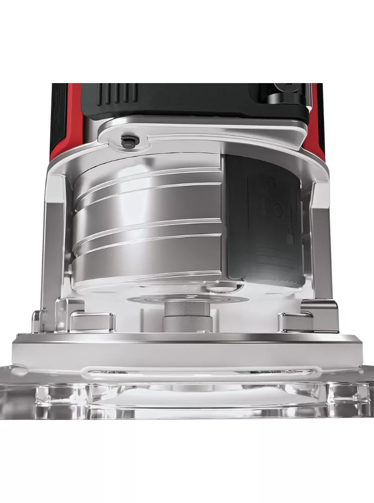 • Držák frézy s pogumovanými úchyty a upínací funkcí umožňuje bezpečné vedení. Díky základně z plexiskla má uživatel neustále volný výhled na frézu, což přináší dokonalý výsledek práce