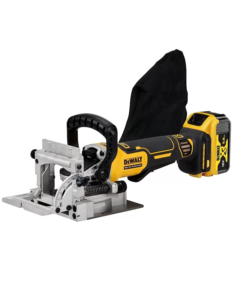 Aku lamelovací frézka 18V 2x5,0Ah DeWALT DCW682P2 s kotoučem o průměru 102 mm a maximální hloubkou řezu 20 mm.
