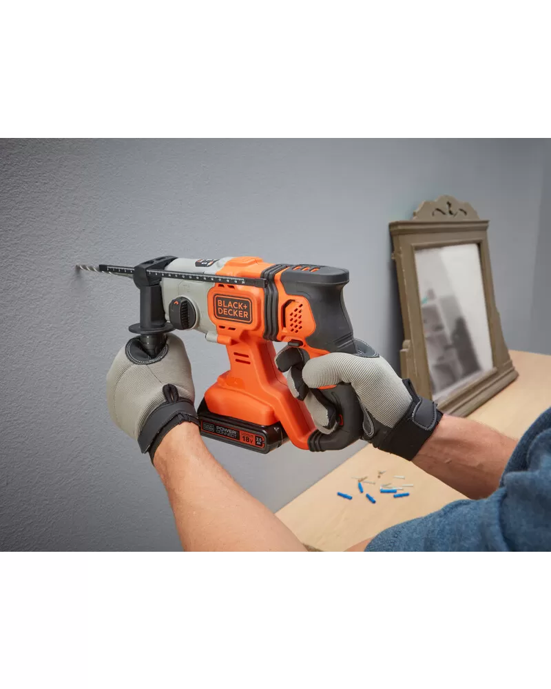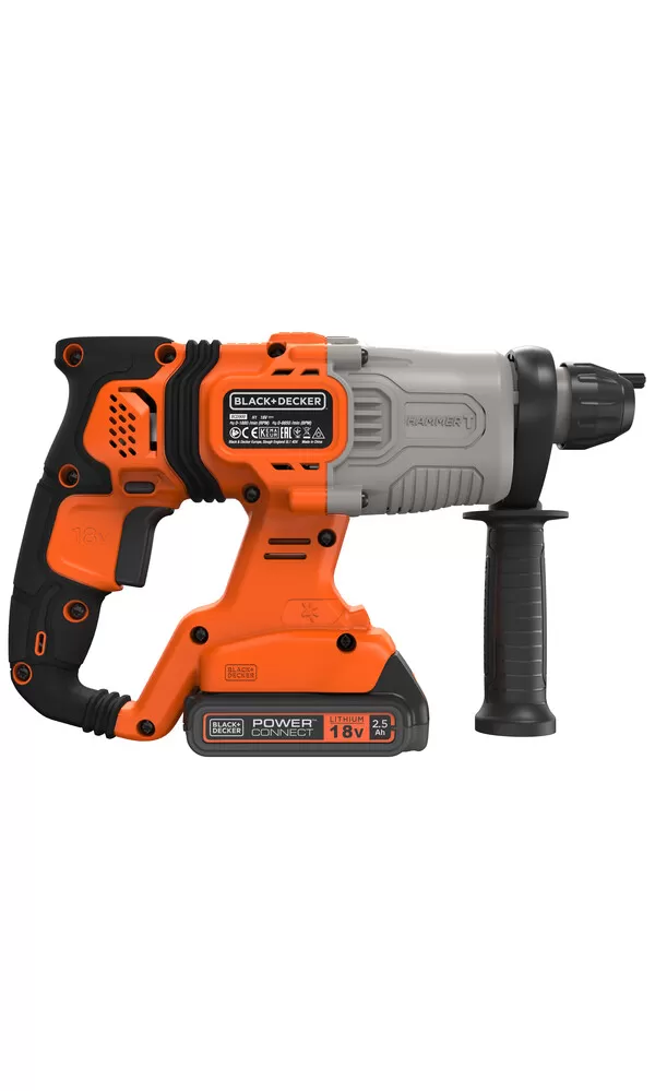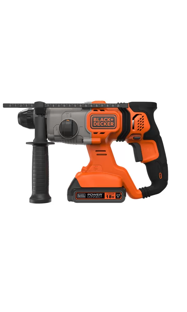 18V příklepová vrtačka SDS-Plus je součástí systému vyměnitelných baterií 18V POWERCONNECT™ a poskytuje dlouhotrvající výkon bez nutnosti použití kabelu.