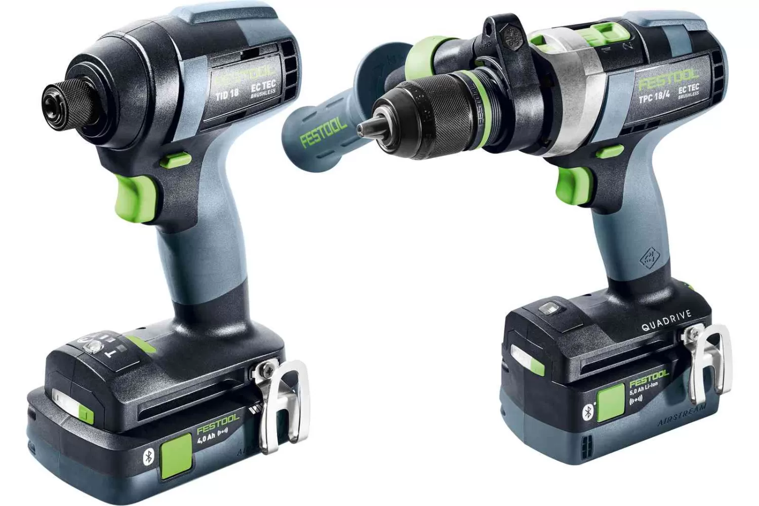 Ryzí síla pro každé použití v kombinaci s nepřekonatelnou robustností a výdrží. S akumulátorovým příklepovým vrtacím šroubovákem TPC 18/4 a akumulátorovým rázovým utahovákem TID 18 budete vybavení na jakékoli vrtání a šroubování. TPC 18/4 přesvědčí nejlepší koncepcí spínače, který jste kdy ovládali. Díky četným nástavcům a kombinaci s perfektně sladěným příslušenstvím představuje QUADRIVE nedostižný příklepový vrtací šroubovák pro nejrůznější možnosti použití. A nebezpečné zkroucení zápěstí při náhlém zablokování nástroje? Inteligentní funkce KickbackStop minimalizuje riziko, že to zajde tak daleko. TID 18 je naproti tomu kompaktní silák s velmi robustním příklepovým mechanismem s mimořádnou životností. Navíc TID 18 s 1" upínáním nástrojů točí výhradně šroubem – a nikoli zápěstím: Zabezpečuje to tangenciální příklepový mechanismus bez unavujícího zpětného rázu. Oba přesvědčí bezuhlíkovým, a tedy bezúdržbovým motorem EC-TEC, který v souhře s akumulátorem zabezpečuje maximální výdrž. Pro bezstarostnou každodenní práci je akumulátorový šroubovák a akumulátor kompletně zabezpečený službami Festool SERVICE.