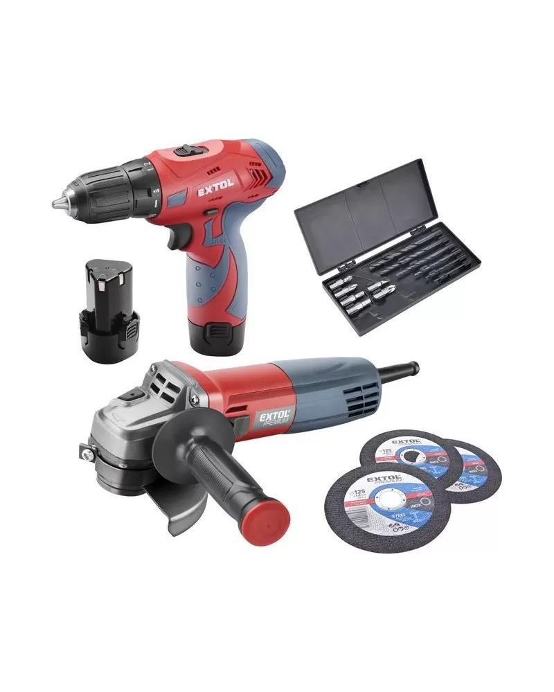 Akční sada obsahující nejpopulárnější elektrické nářadí pro práci - aku vrtací šroubovák a úhlovou brusku. Lehký a výkonný dvourychlostní vrtací šroubovák v ultra kompaktní velikosti je ideální pro středně těžké vrtání a šroubování do kovu a dřeva. Malá, praktická bruska určená pro lehké řezací a brusné práce, odbrušování svařovacích švů apod. Kompaktní rozměry umožňují pohodlnou práci jednou rukou. Celá sada je uložena v kvalitním boxu, který je kompatibilní s Extol Premium boxy. Součástí sady je také pouzdro s vrtáky a hroty a řezací kotouče.