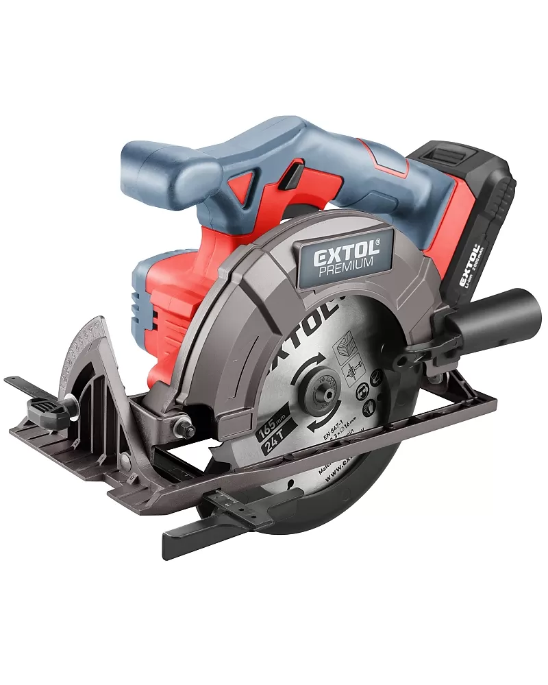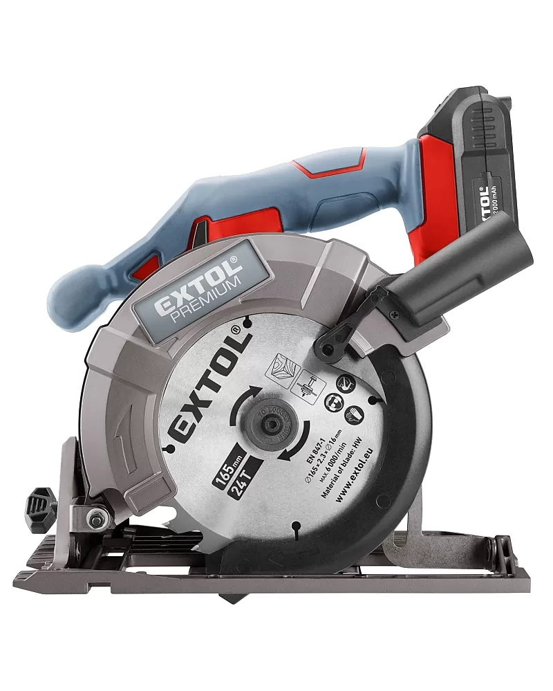 Aku kotoučová pila 165mm 20V 2,0Ah Extol Premium 8891822 pro výkonné a snadné řezání při různých instalatérských, elektrických, rámovacích, dokončovacích a tesařských pracích.