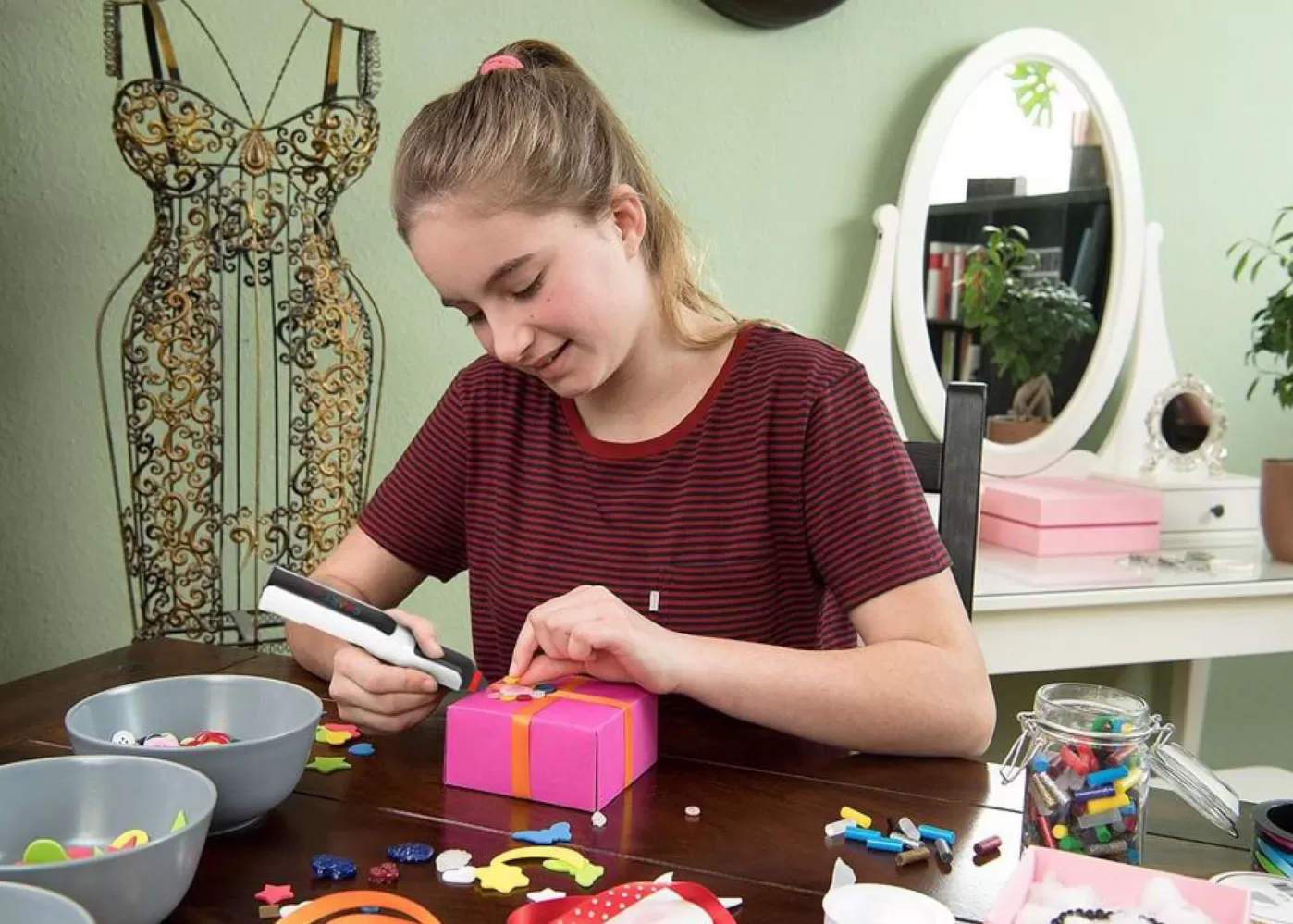 • Je vhodné také pro různé projekty kde je nutné používat různé barvy lepidla, protože má dobře vyřešenou výměnu barevných tyčinek