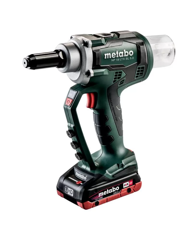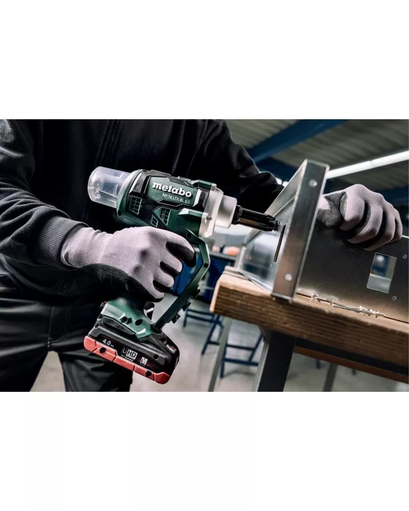Akumulátorová nýtovací pistole 18V/ 2x4,0 Ah Metabo NP 18 LTX BL 5.0 dlouhá životnost díky bezkartáčovému motoru a robustní a přesné převodovce
