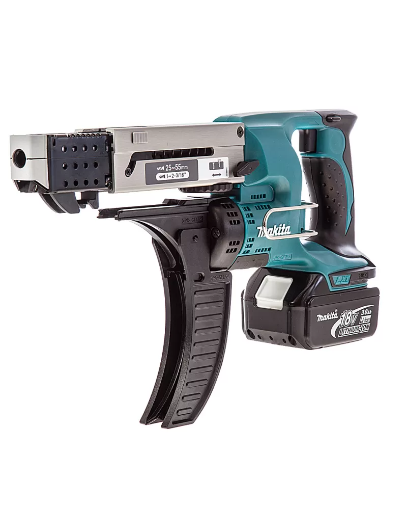 Aku šroubovák se zásobníkem 2x3,0Ah 18V Makita DFR550RFE se speciální konstrukcí vodicího nástavce zaručující ideální pozici pásu.