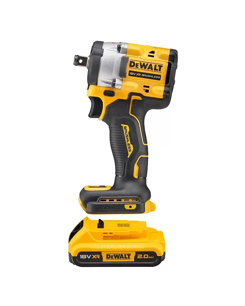 Aku rázový utahovák 18V DeWALT DCF921D2T s utahovacím momentem 406Nm upínáním na 1/2" čtyřhran s pojistným kroužkem pro rychlou výměnu nástrčného klíče.