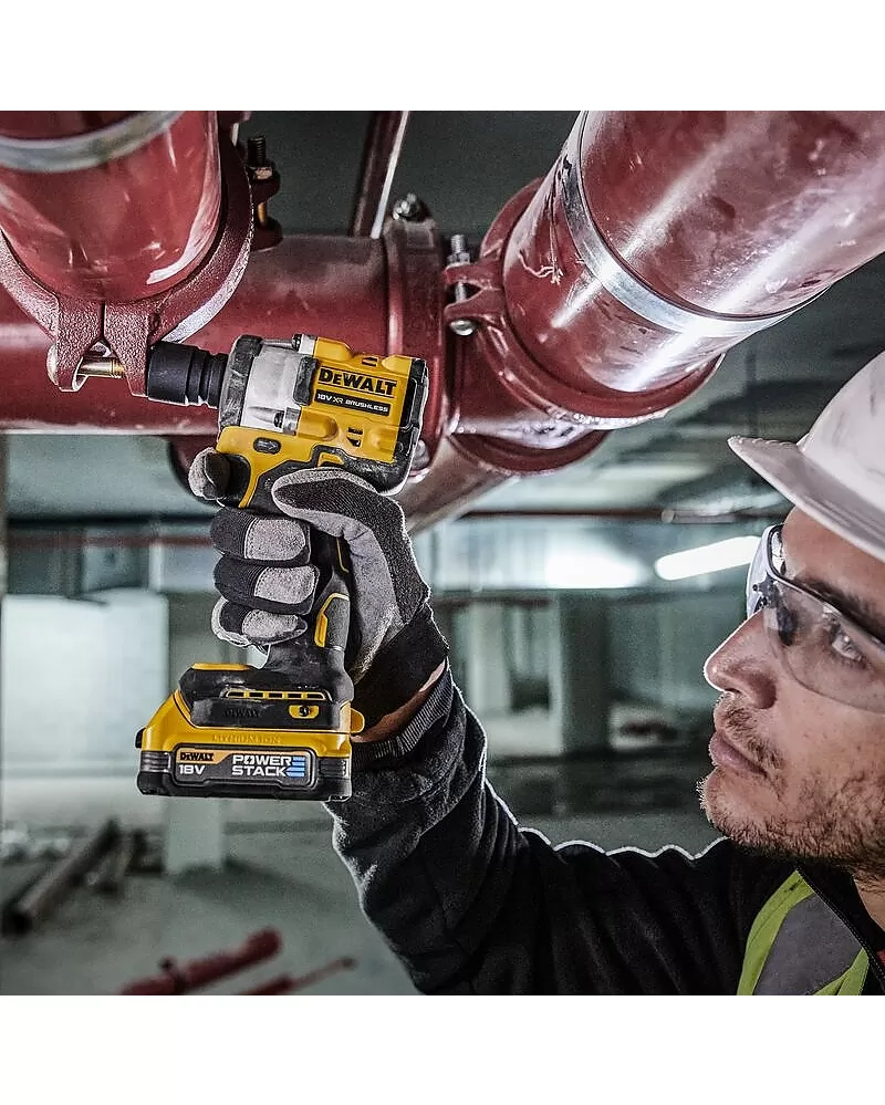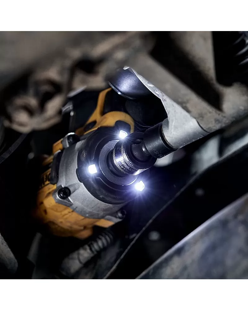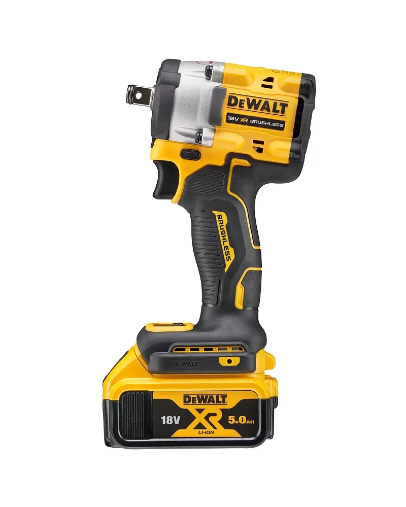 Aku rázový utahovák 18V DeWALT DCF921P2T s utahovacím momentem 406Nm upínáním na 1/2" čtyřhran s pojistným kroužkem pro rychlou výměnu nástrčného klíče.