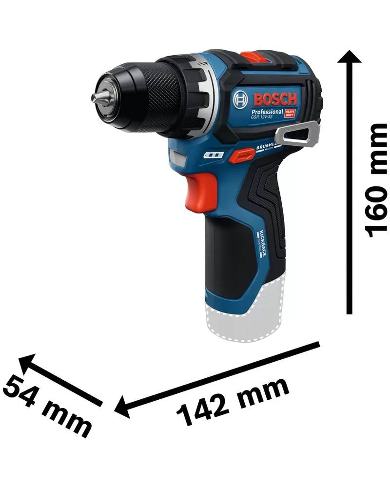 Další informace: GSR 12V-32 Professional je vybaven funkcí Advanced KickBack Control, bezuhlíkovým motorem, robustním kovovým sklíčidlem, jasným pracovním světlem a sponou na opasek.