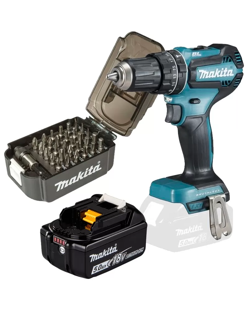 Silný a přitom kompaktní aku bezuhlíkový příklepový šroubovák s nízkou hmotností 18V bez aku Makita DHP485Z. Výhodný set s 18V 5,0Ah baterií a sadou bitů ve tvaru akumulátoru.
