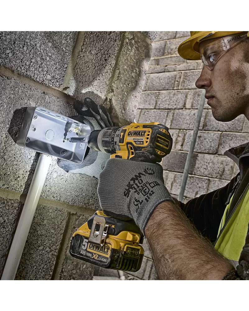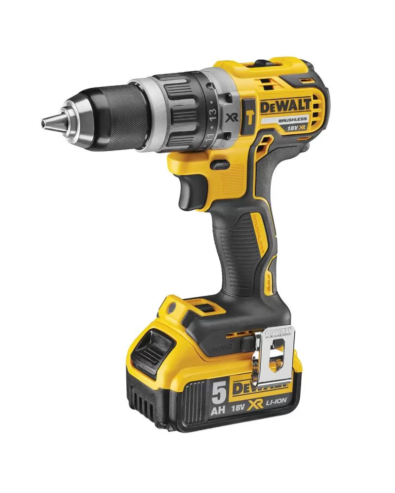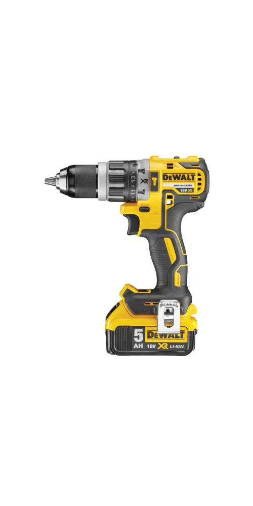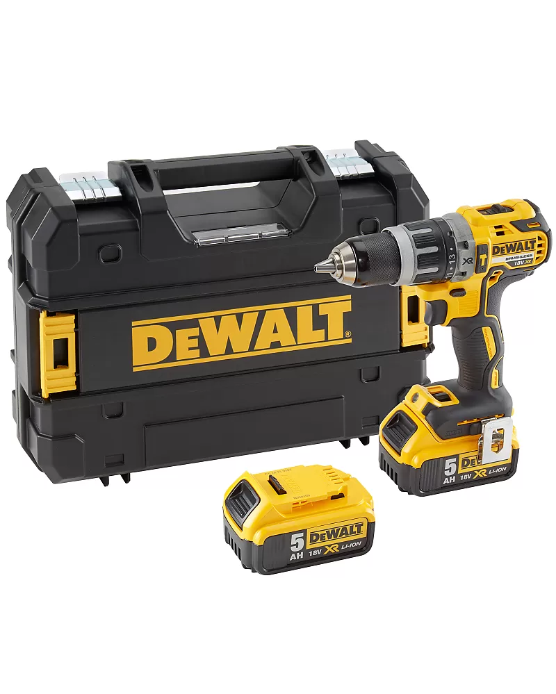Aku bezuhlíková vrtačka s příklepem 18V 2x5,0Ah DeWALT DCD796P2 disponující celokovovou dvourychlostní převodovkou a 15ti polohami utahovacího momentu.