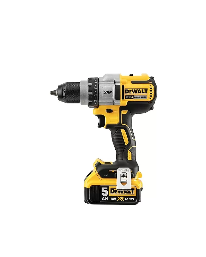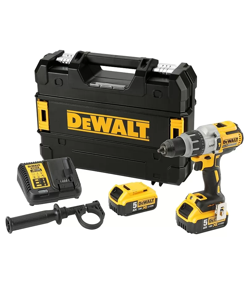 Nejnovější generace bezuhlíkové příklepové vrtačky DeWALT DCD996P2 včetně dvou akumulátorů 5,0Ah 18V a praktického kufru.