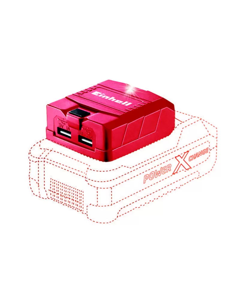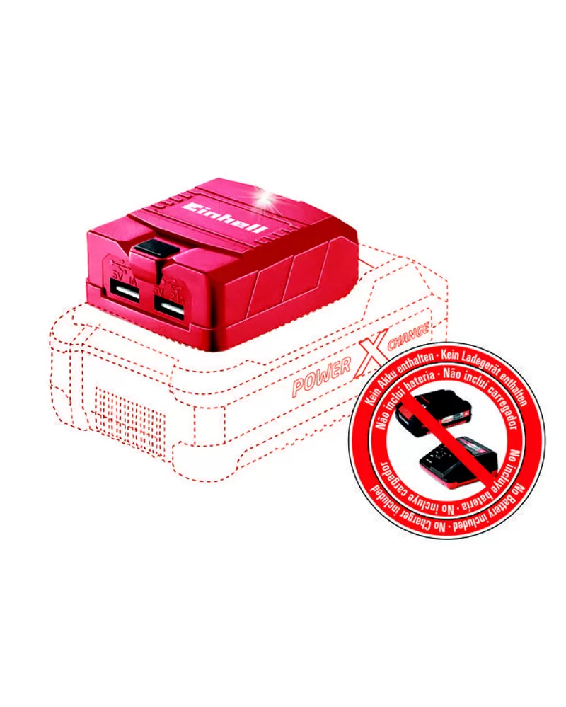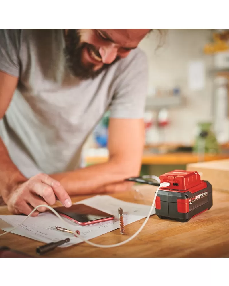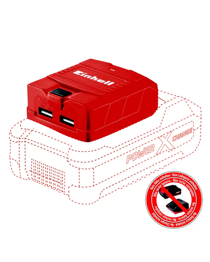 • USB aku adaptér Einhell TE-CP 18 Li USB-Solo je praktický a mobilní zdroj napájení pro nabíjení mobilních telefonů, tabletů, MP3 přehrávačů a mnoha dalších malých spotřebičů používaných na cestách