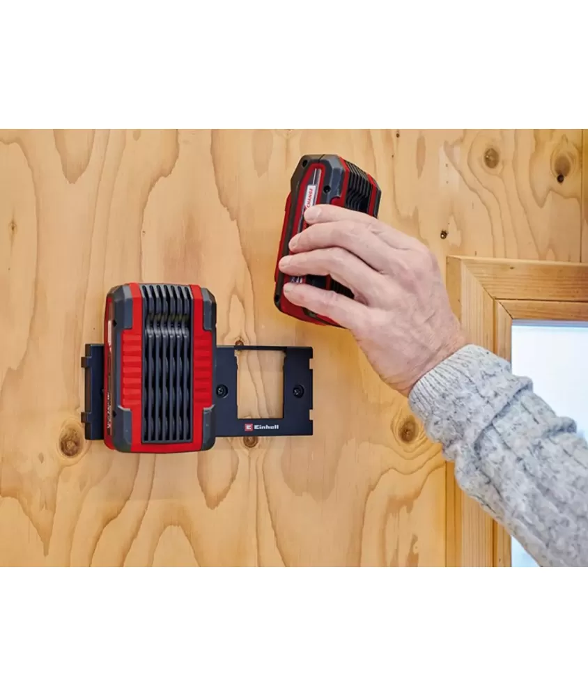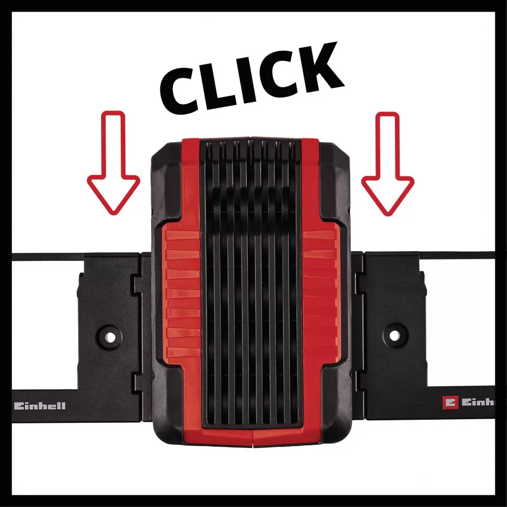 Nástěnný držák na baterie Einhell Power X-Change je kompatibilní se všemi bateriemi Power X-Change od Einhellu. Výhodou je chytrá modulární konstrukce, díky které lze držák na baterie nekonečně rozšiřovat a uložit tak neomezené množství baterií. Díky tomu nabízí nástěnný držák na baterie maximální variabilitu pro jakékoli pracoviště. Snadná instalace díky pero-drážkovému spoji. Funkce zacvaknutí nástavce zajišťuje bezpečnou fixaci, a to i při montáži nad hlavou. Díky tomu jej lze bezpečně namontovat také v karavanech a automobilech. Sada obsahuje čtyři šrouby pro montáž na dřevěnou stěnu a čtyři hmoždinky pro montáž do betonové zdi.