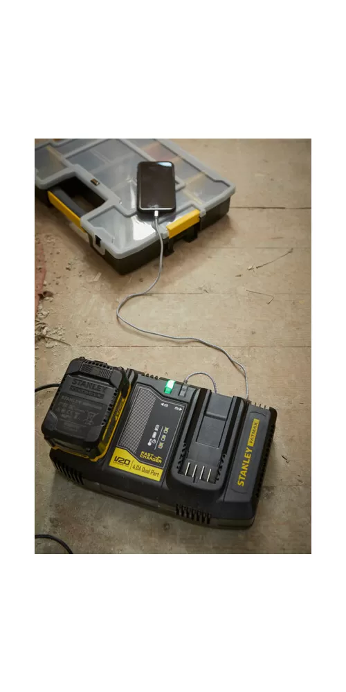 • Nabíječka je součástí 18V STANLEY® FATMAX® V20 Cordless System, napájejte všechny své nářadí V20 pomocí běžné nové a vylepšené 18V lithium-iontové baterie, která vám umožní snadno a déle pracovat