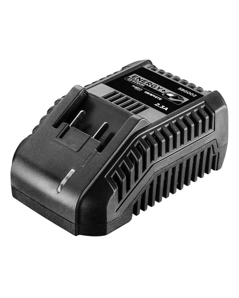 Nabíječka akumulátorů GRAPHITE Energy+ 18V Li-Ion, maximální dobíjecí proud 2,3A, doba nabíjení akumulátoru 58G001 činí 1 hodinu, doba nabíjení akumulátoru 58G004 činí 2 hodiny.