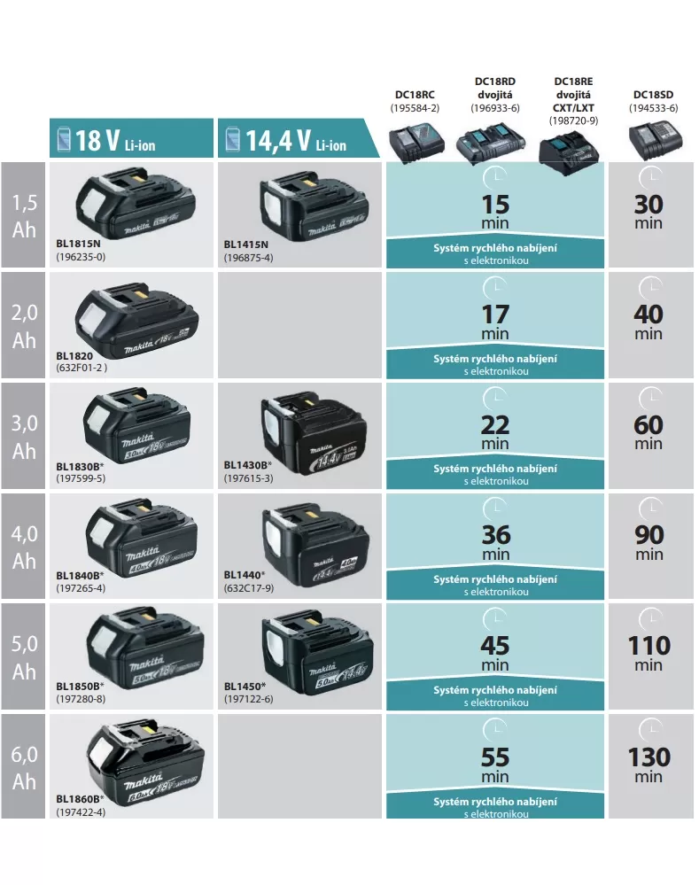 MAKITA vyvinula originální nabíjecí systém s vestavěným chlazením. Po vložení akumulátoru do nabíječky dochází k rychlému ochlazení teploty akumulátoru, které výrazně urychlí čas nabíjení. Navíc chlazení reguluje teplotu akumulátoru i v průběhu nabíjení.