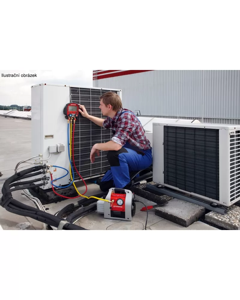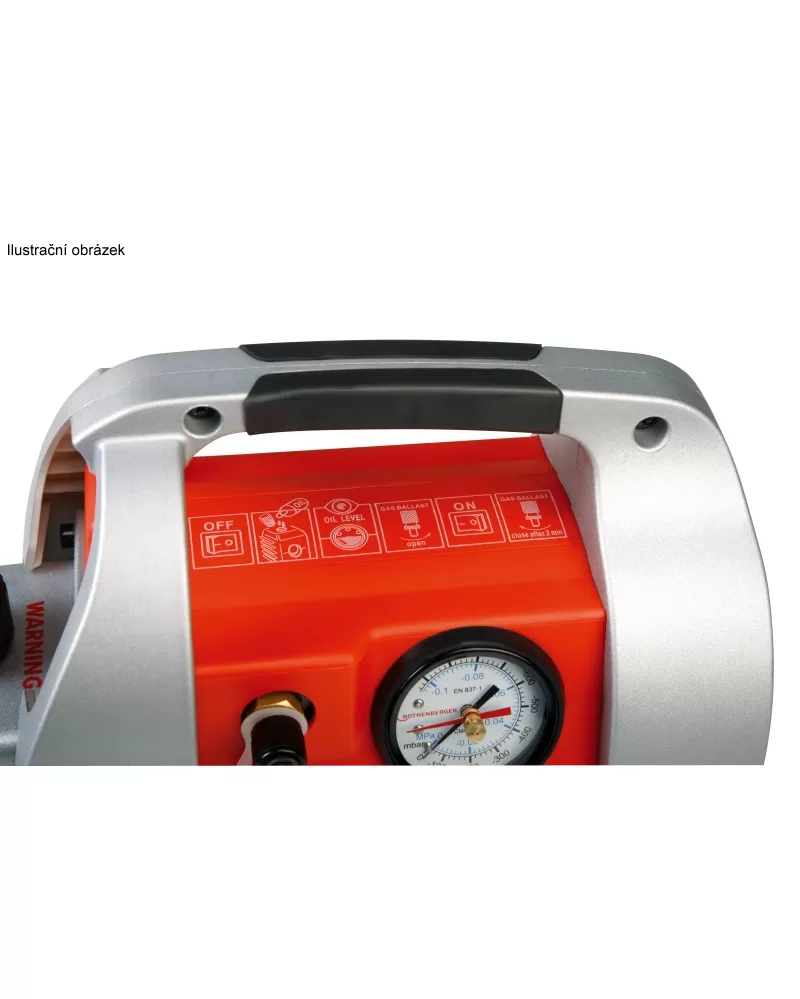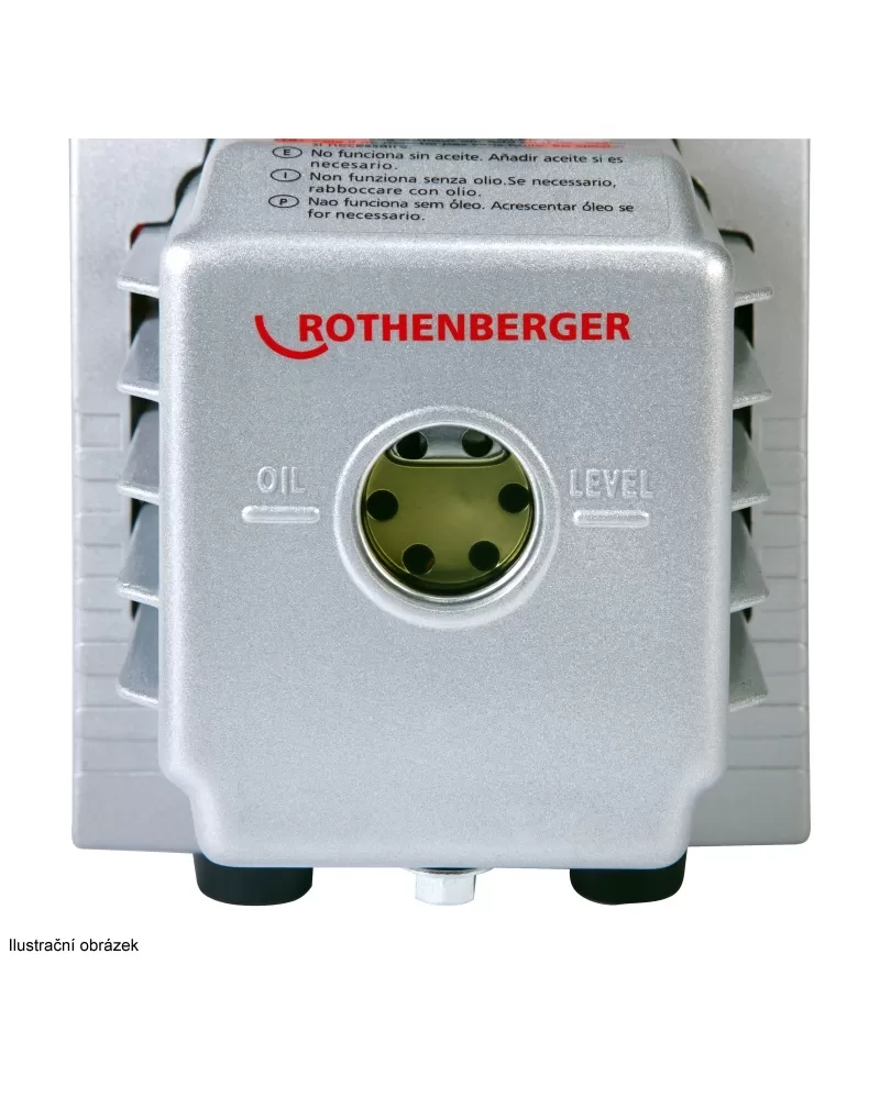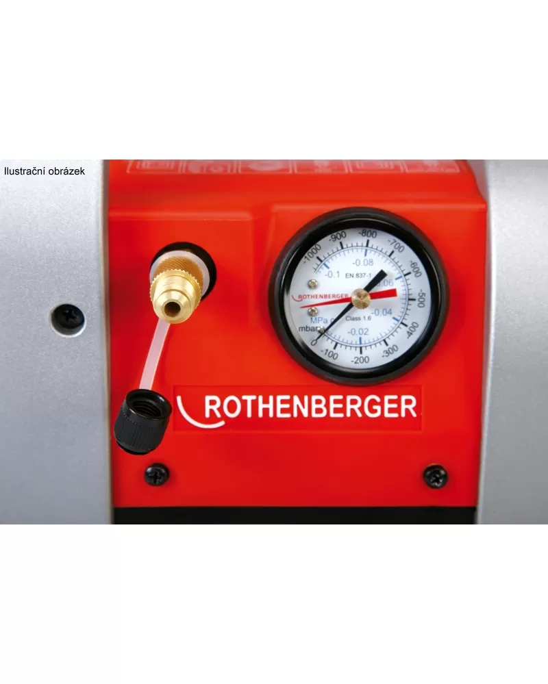 Dvoustupňová vysokovakuová vývěva ROTHENBERGER ROAIRVAC R32 6.0 pro evakuaci dle DIN 8975, včetně vakuometru a magnetického zpětného ventilu.