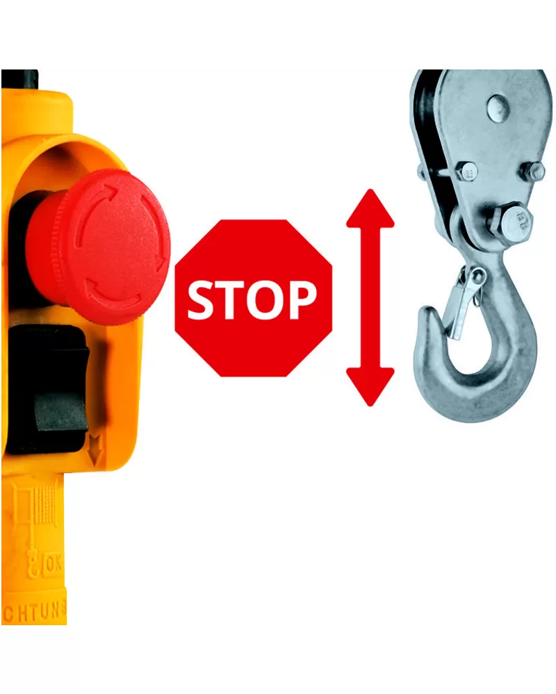• K vyšší bezpečnosti přispívají ovládací spínač s nouzovým vypnutím a bezpečnostní úchyt na závěsném háku