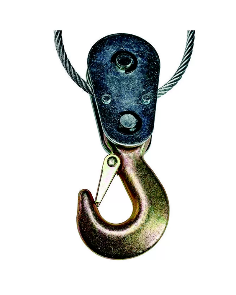 • Součástí dodávky je 3,3 metru dlouhé, nekroucené ocelové lano (O 6 mm) a kladka se zátěžovým hákem, která má bezpečnostní držák
