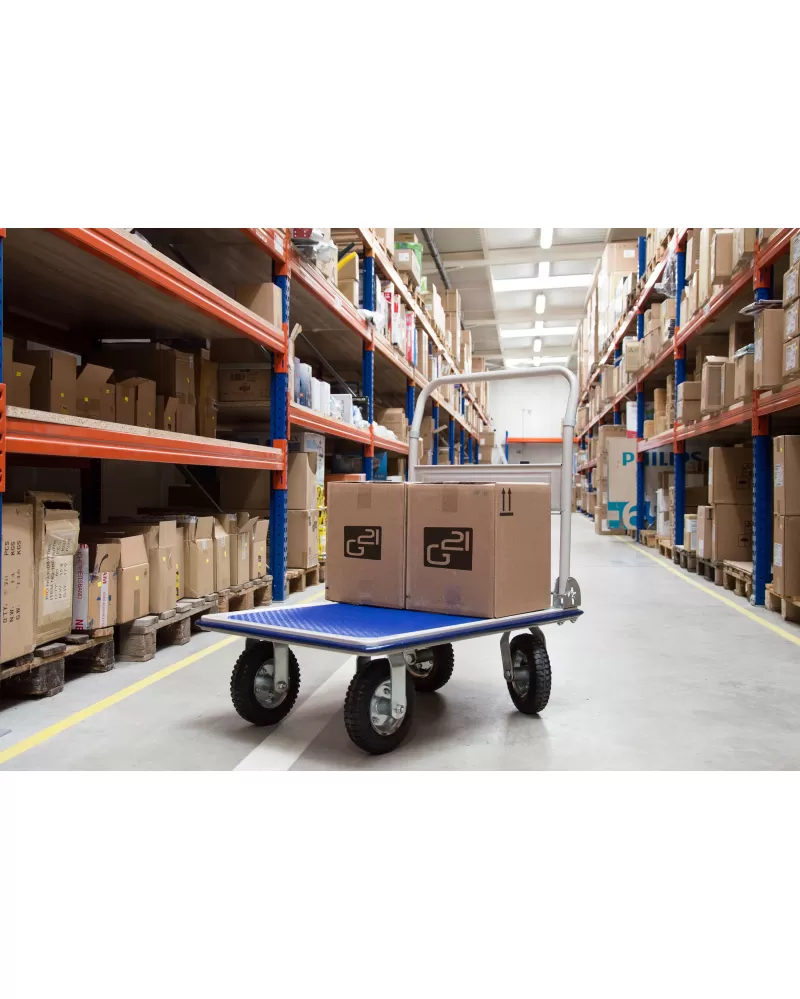 • Plošinový vozík G21 300 kg je skladový vozík se sklopným ergonomickým madlem a nosností až 300 kg.