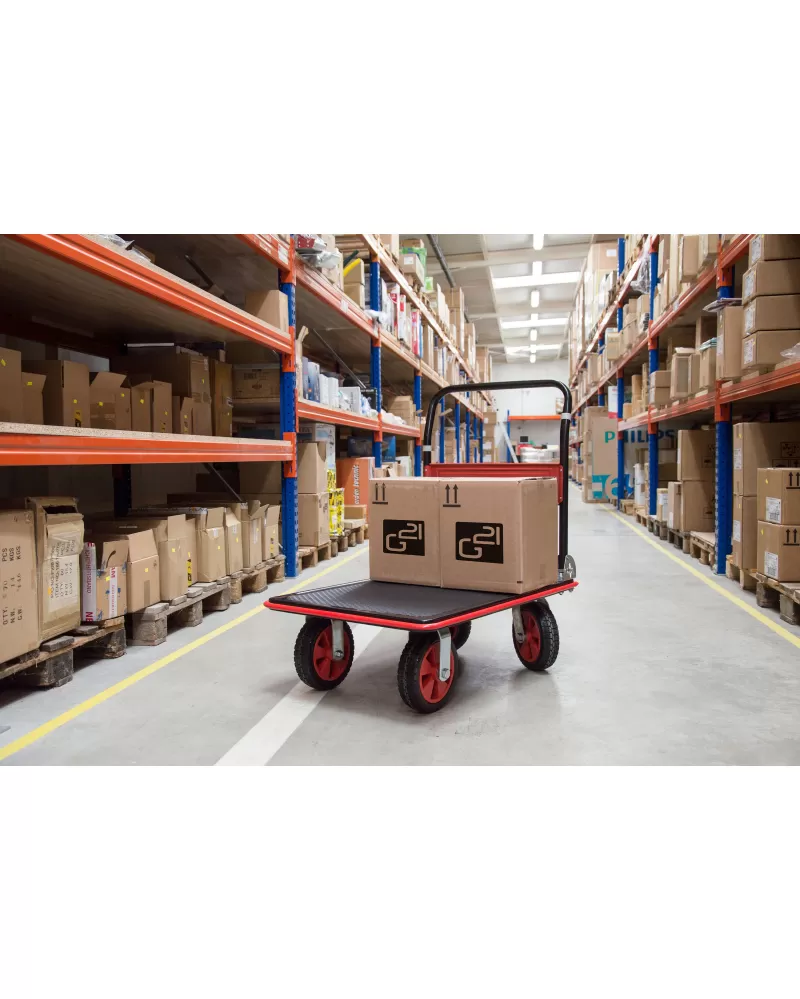 • Manipulační plošinový vozík G21 má 4 pevná kola z odolné tvrzené gumy, která nezanechává černé stopy a nenaruší čistý povrch podlahy ve skladě, na prodejně ani v domácnosti.
