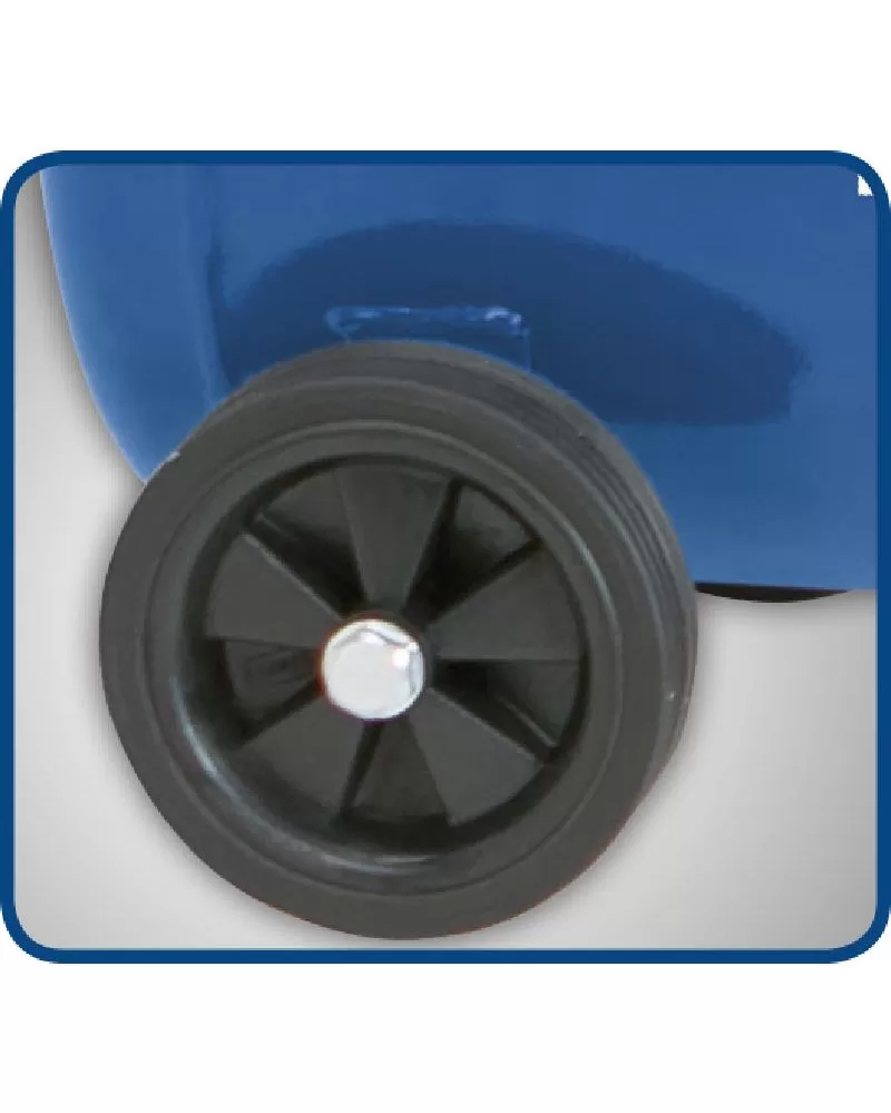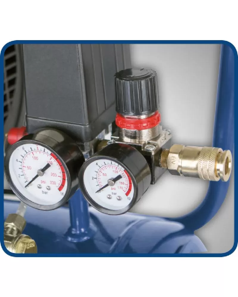 Další výbava: manometr vzdušníku, manometr pro kontrolu nastaveného pracovního tlaku, redukční ventil, tlakový spínač, odkalovací ventil, zpětný ventil, pojistný ventil, vzduchový filtr, pojezdová kola, rukojeť