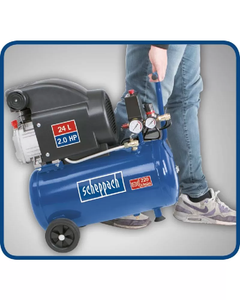 Kompresor Scheppach HC 25 je nezbytným pomocníkem, který by neměl chybět v žádné domácí dílně. Pumpa stroje je u tohoto kompresoru mazána olejem, což prodlužuje životnost celého stroje i při častém používání. Kontrola oleje je velmi jednoduchá a provádí se zběžným pohledem pomocí optického ukazatele umístěném na stroji. Vzdušník slouží jako zásobárna stlačeného vzduchu a motor se tak zapíná jen v případě, že tlak vzduchu klesne pod požadovanou úroveň. Díky vzdušníku můžete s kompresorem provádět i náročnější operace, než je běžné huštění či ofukování. Můžete k němu připojit třeba sponkovačku nebo zvládne i méně náročné práce se stříkací pistolí a dalšími pneumatickými nástroji. Při dofukování pneumatik zase oceníte jednoduché nastavení výše tlaku, který můžete snadno kontrolovat pomocí vestavěného manometru. Přídavná rukojeť a kolečka umožní snadnou manipulaci se strojem. Stroj je díky svým kompaktním rozměrům velmi skladný a dá se snadno převážet.