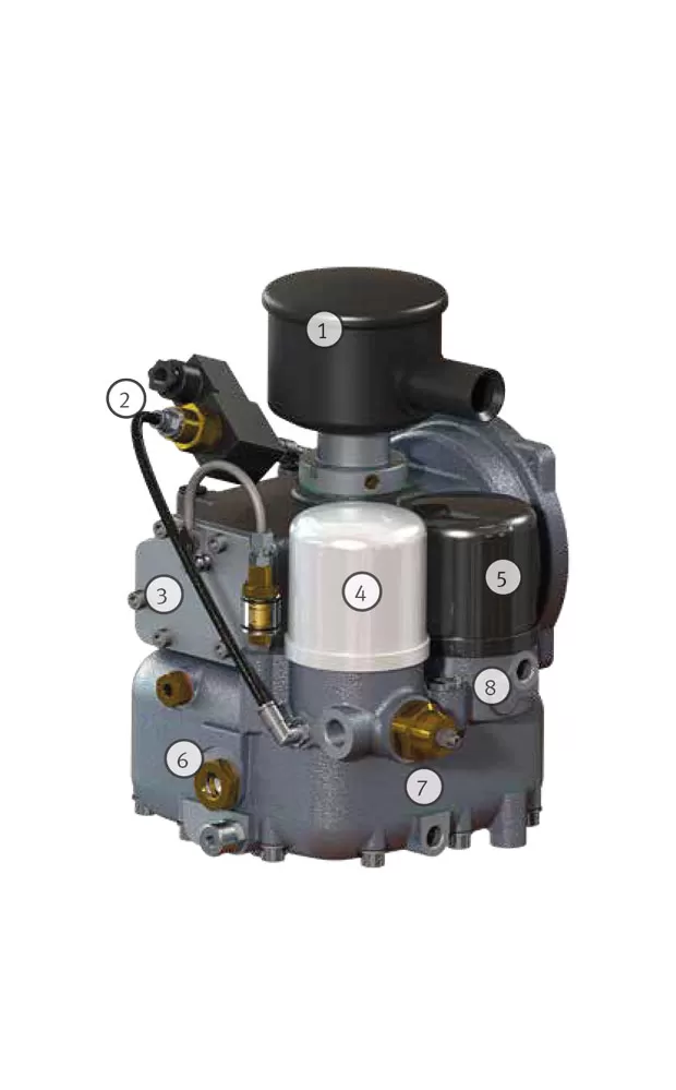 • Efektivní separace oleje pomocí gravitace, protože olejová jímka je na nejnižší úrovni