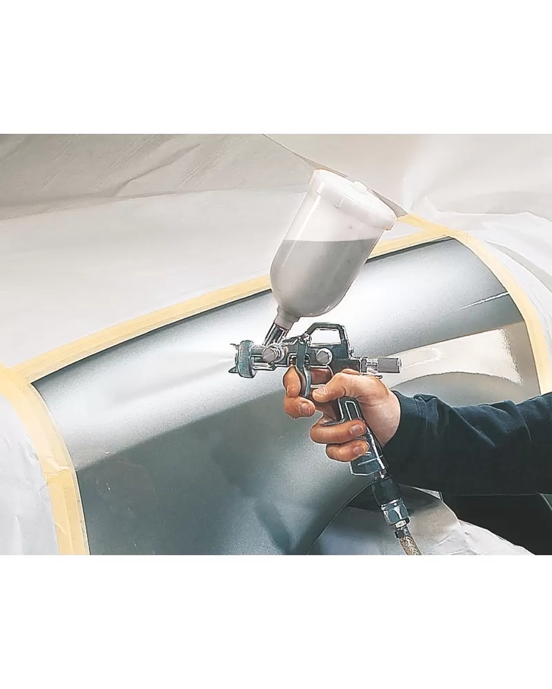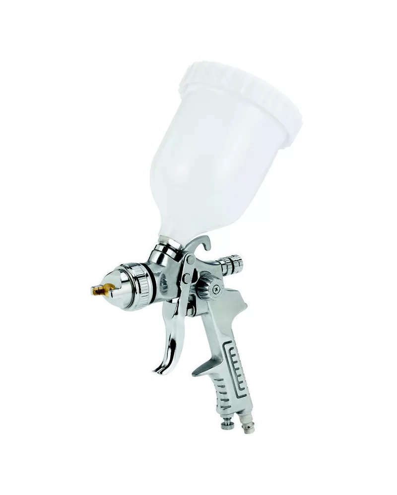 • Profesionální stříkací pistole s gravitační nádobou je robustní a přesné zařízení pro náročné lakýrnické práce s pracovním tlakem 3 až 3,5 bar