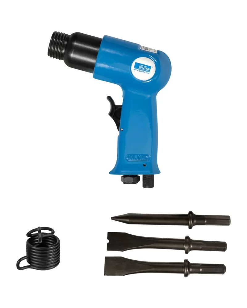 • Příslušenství: sada nástrčných klíčů (8), adaptér ?“-1“, bitový adaptér ?“, sada bitů (9), sada sekáčů (3, včetně přídržné pružiny), sada brusných kolíků (10), sada pneu adaptérů a trysek, teflonová páska, suvky 1“ (5), transportní plastový kufřík (uzpůsoben pro montáž na stěnu dílny)