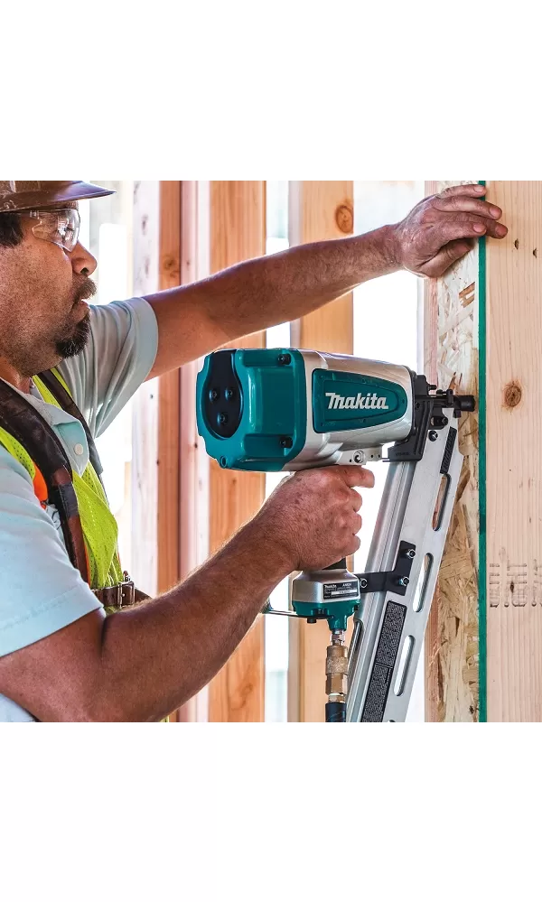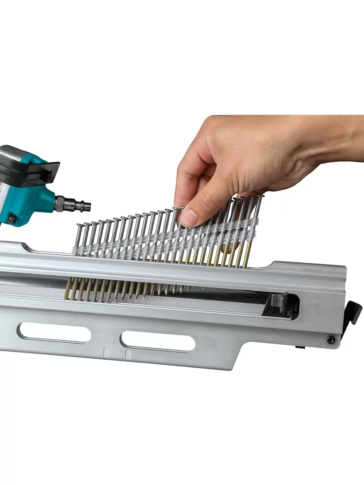 Pneumatická hřebíkovačka 50-90mm Makita AN924 Pro hřebíky s kulatou hlavou páskované v plastu pod úhlem 21° Protiskluzový adaptér ústí… Celý popis