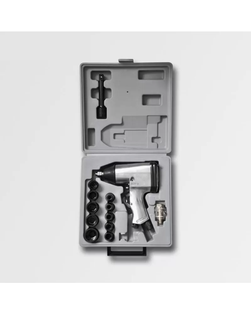 • Sada obsahuje: hlavice 1/2" 9,10,11,13,14,17,19,22,24,27, nástavec 1/2"125mm; rychlospojka a mazací filtr, imbus klíč 4; plastový kufr