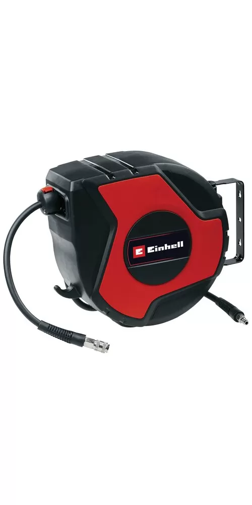 Hadicový naviják na stlačený vzduch Einhell TC-PH 150 je vždy připraven k použití a hodí se pro všechny práce v domácnosti, dílně i garáži. Hadici lze také rychle a bezpečně uložit, takže nehrozí nebezpečí zakopnutí a nehody. Hadicový naviják se skládá z 15metrové hadice na stlačený vzduch a 1,5metrové připojovací hadice (každá o vnitřním průměru 9 mm). Max. pracovní tlak 16 barů. Obě hadice se skládají z PVC a gumy. Díky tomuto materiálu jsou hadice pružné a odolné vůči zalomení. Díky automatickému skenování je možná práce bez namáhání. Hadice se bezpečně sroluje díky automatickému pomalému zatahování. Vrstvové vinutí zabraňuje ucpávání hadice. Háček na krytu umožňuje připevnění ofukovací pistoli. Součástí balení je také nástěnný držák otočný o 170° pro flexibilní použití. Montážní příslušenství pro nástěnný držák je součástí dodávky.