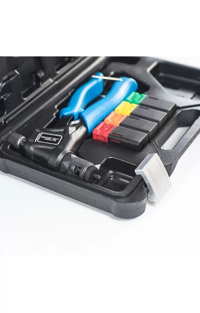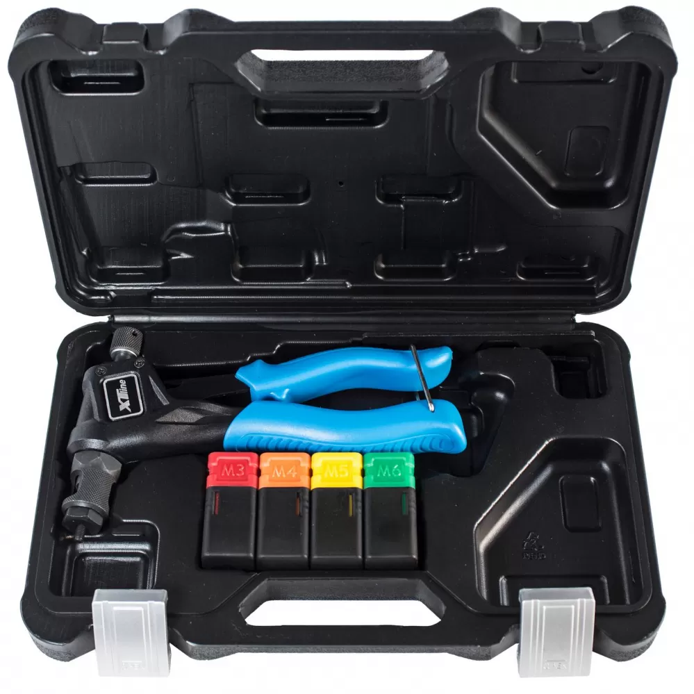• Komfort při práci zajišťuje odolné lehké tělo z hliníkové slitiny, tvrzené Cr-Mo čelisti, koncovky pro maticové nýty M3, M4, M5, M6 a klíč pro výměnu koncovek.