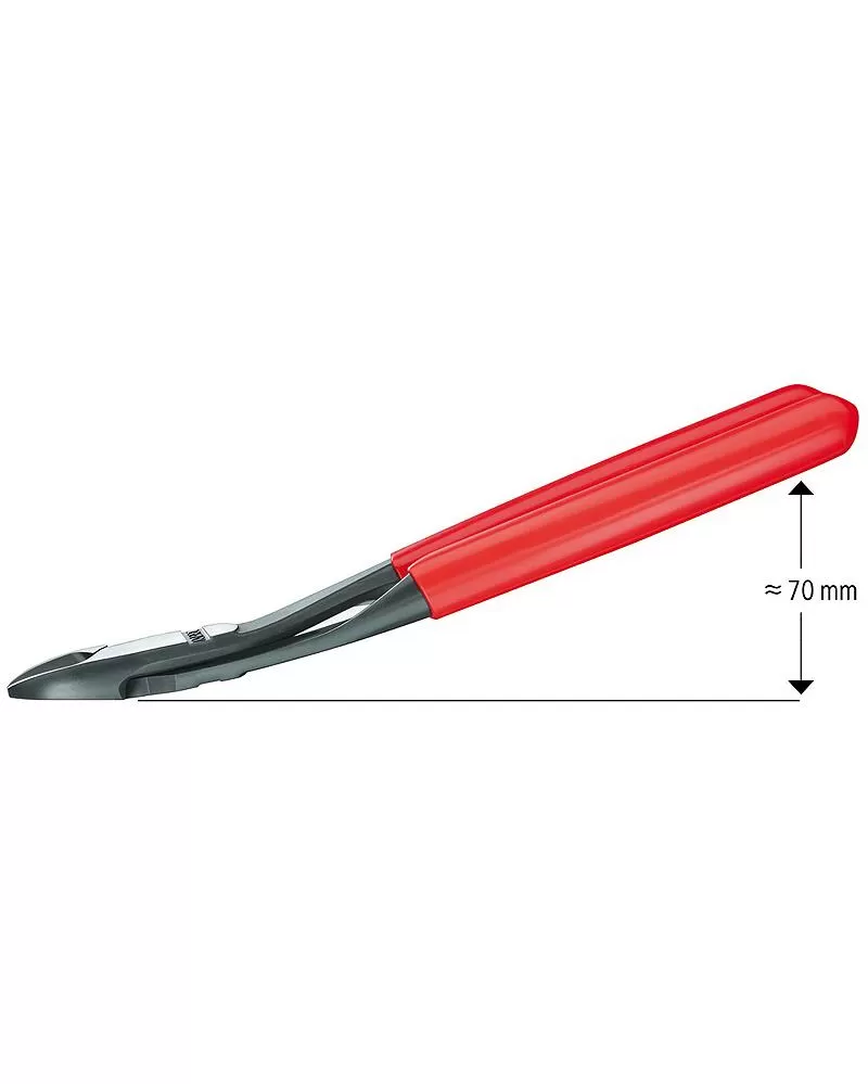 • ve srovnání s obvyklými bočními štípacími kleštěmi stejné délky se zakovanou osou kloubu.