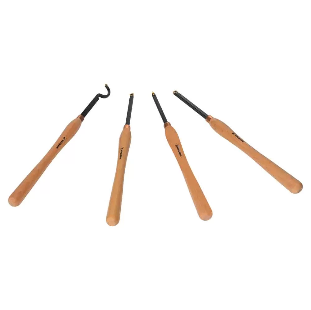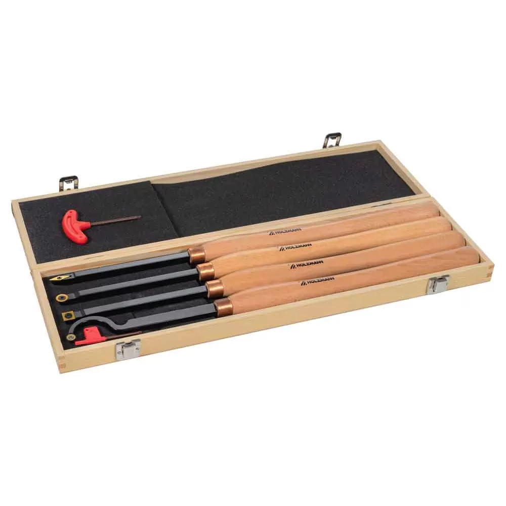 4-dílná sada dlát pro soustružení dřeva HOLZMANN (velikost XL) s výměnnými karbidovými destičkami je ideální pro vaše soustružnické práce. Sada se skládá z dláta se čtyřhranným karbidovým hrotem, karbidového hrotu s kulatými destičkami (rovná / háková stopka) a diamantového karbidového hrotu.