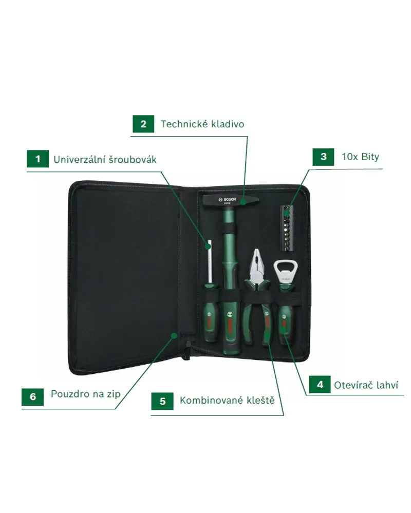 • Obsahuje kombinované kleště, odlamovací nůž, univerzální šroubovák s 10 bity a kladivo v praktickém látkovém pouzdře na zip
