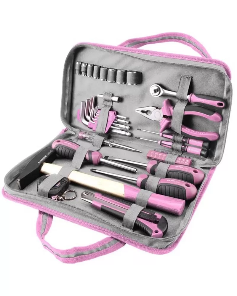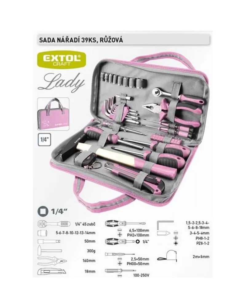 Kvalitní sada nářadí EXTOL CRAFT 6596 obsahuje 39 dílů. Proč kupovat stále jen nádobí nebo kosmetiku, potěšte svou drahou polovičku touto skvělou sadou nářadí, navrženou pro šikovné slečny a dámy.