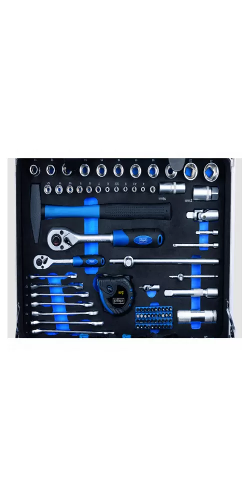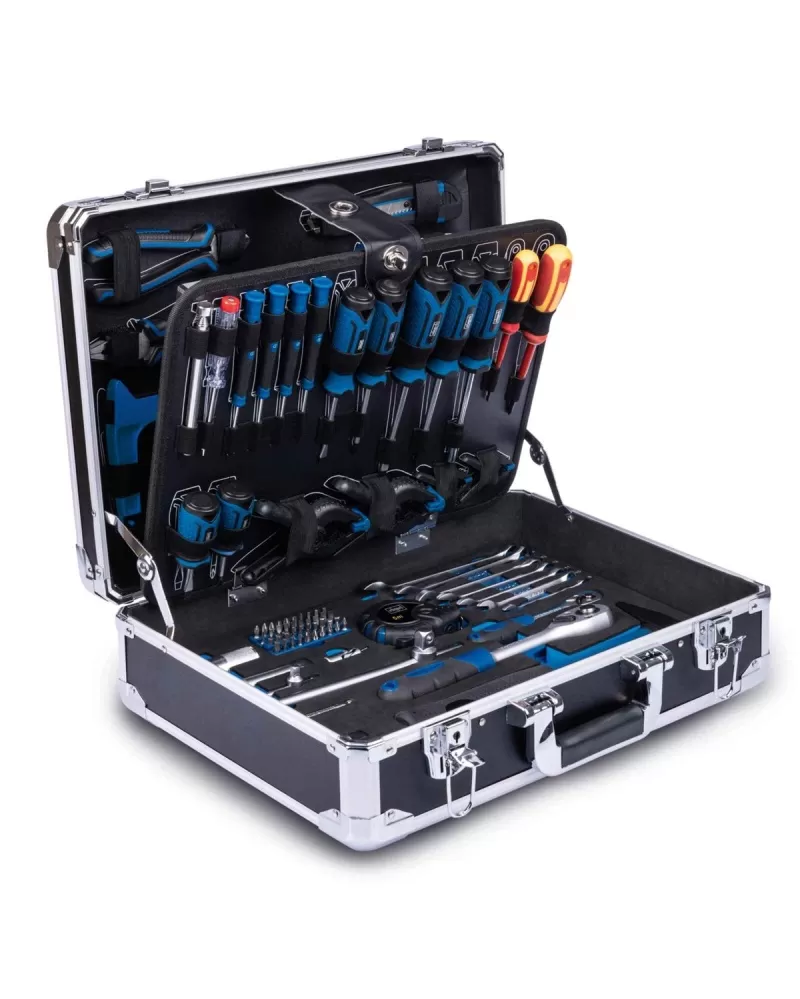 • Je ideální i jako první sada nářadí, kterou si pořizujete. Naleznete v ní nejen všechny běžné klíče, šroubováky, box s bity, ráčny, ořechy, ale i metr, vodováhu, pilník, kleště, kladivo, pilu, nůž, zkoušečku, sadu svorek, baterku a další užitečné pomocníky. Vše je ukryté v robustním hliníkovém kufru s vyztuženými rohy.