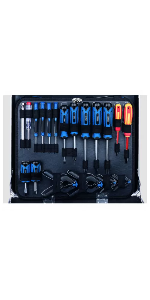 • Každý kus nářadí má přesně stanovené místo a bude tak vždy a rychle po ruce. I díky svým rozměrům kufr nezabere moc místa, dá se pomocí přezek a zámku pevně uzavřít a můžete ho snadno přenést na místo, kde budete nářadí potřebovat.