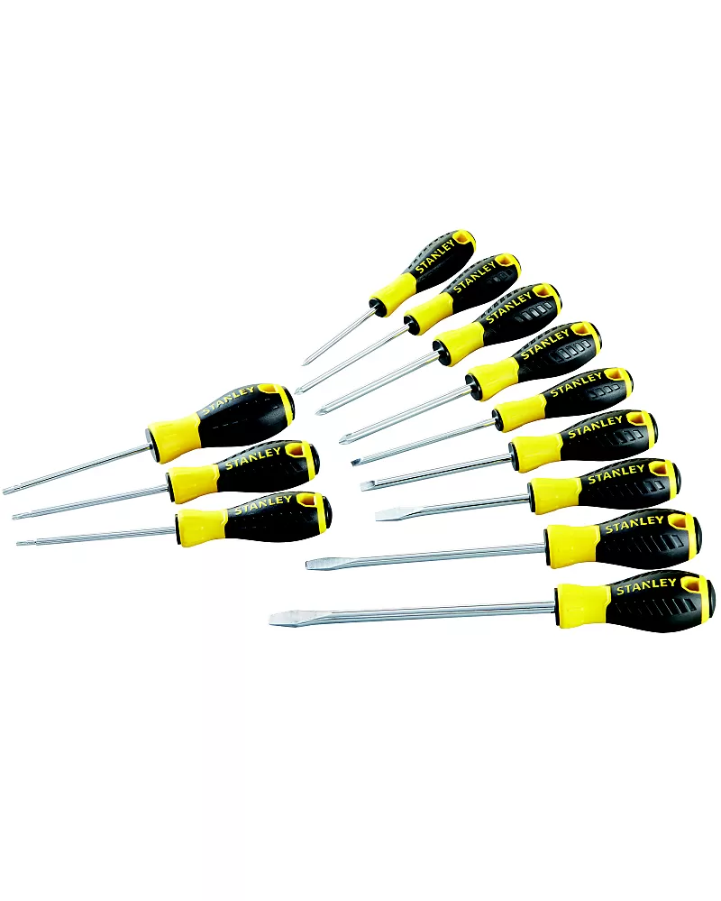 12dílná sada šroubováků Essential Stanley STHT0-60212 s bimateriální rukojetí a dříkem z chrom-vanadové oceli.