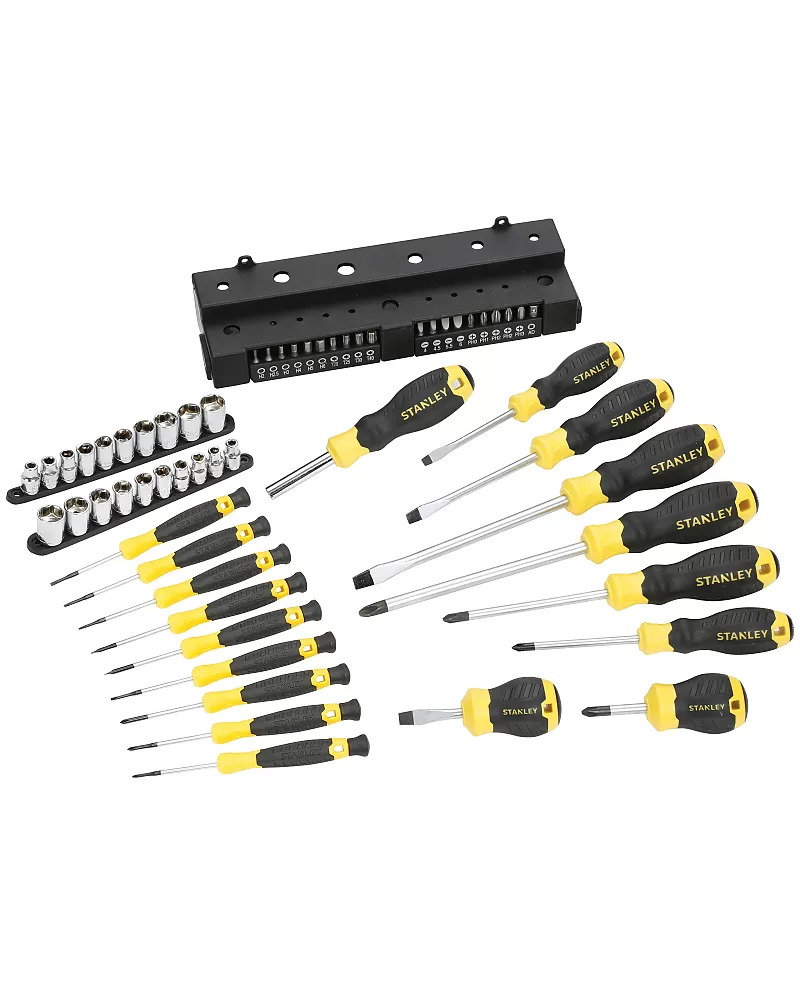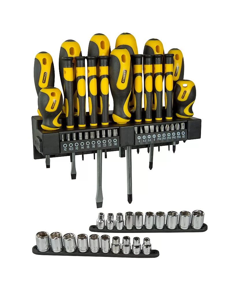 57dílná sada šroubováků, bitů a hlavic STANLEY STHT0-62143 obsahující ploché, torx a philips šroubováky s praktickým držákem.